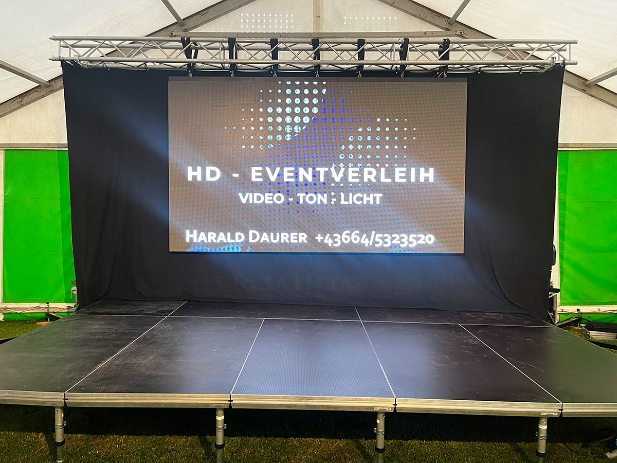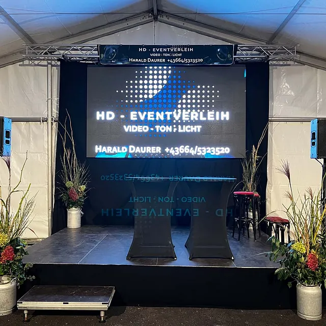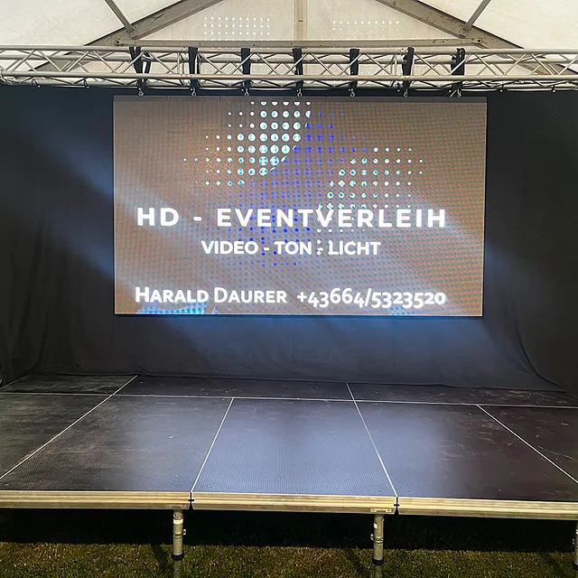 Ein starkes Event braucht eine starke Bühne. Mit hochwertigen Bühnenpodesten von Tüchler und moderner LED Wall-Technik bis 7m² bieten wir Ihnen flexible Lösungen für kleine und große Veranstaltungen. Ob Produktpräsentation, Open-Air oder Galaabend – wir gestalten den perfekten Rahmen für Ihren Auftritt. Stabilität, Sicherheit und Design stehen dabei an erster Stelle. HD-Eventverleih sorgt dafür, dass Ihre Bühne nicht nur hält, sondern beeindruckt.